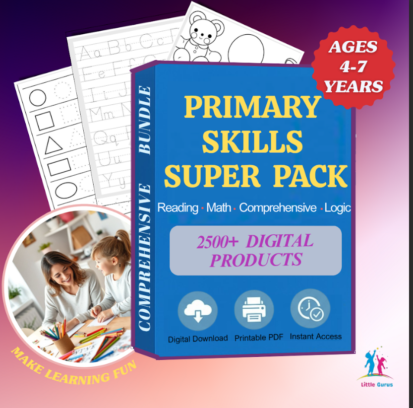 This pack strengthens reading, writing, math, logic, and early comprehension through storybooks, worksheets, puzzles, and activity sheets designed for ages 4 to 7.